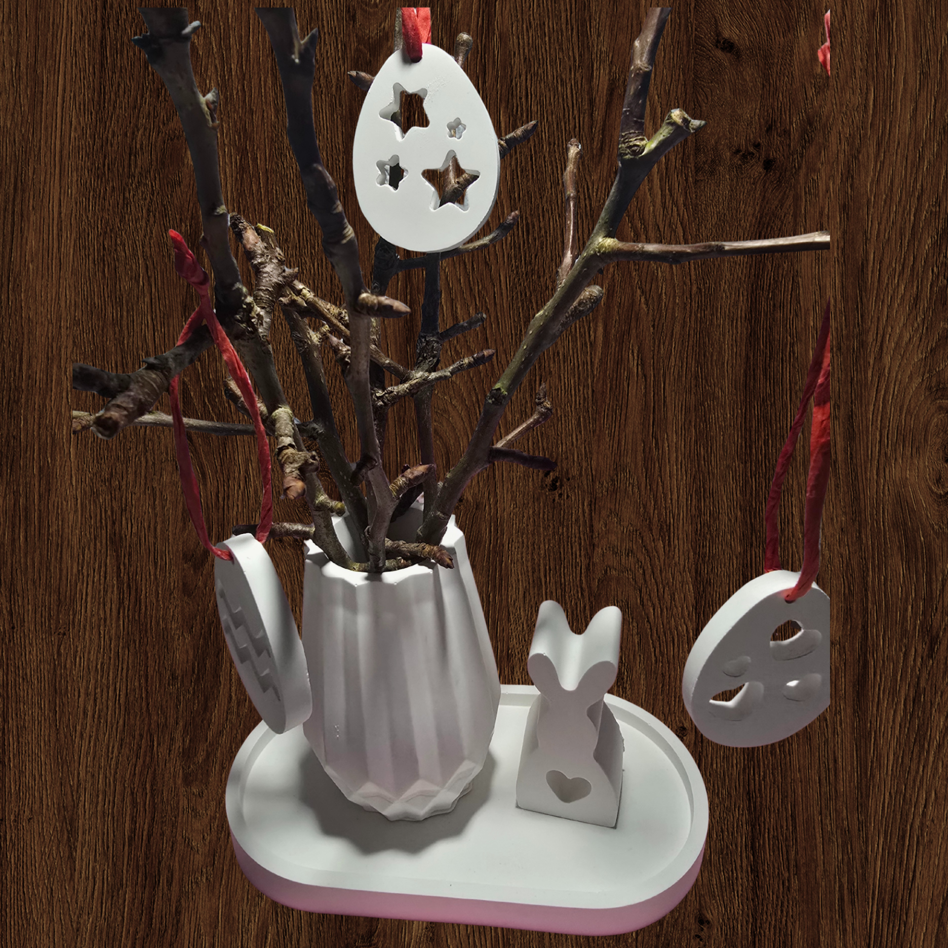 Handgemachtes Oster-Deko-Set aus Gips – Hase, Tablett & Anhänger